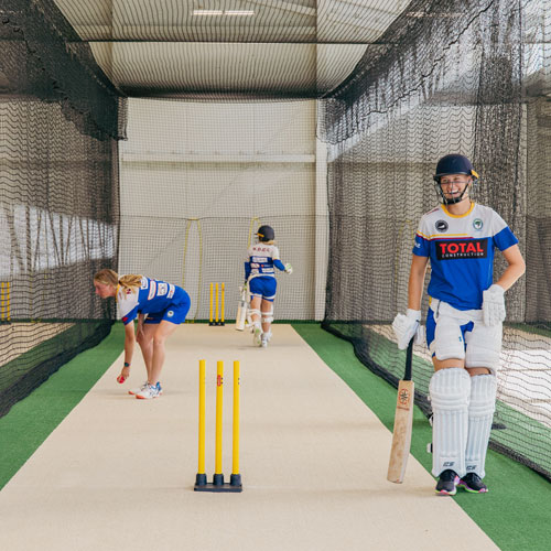 Four cages each 105 ft long and 12 ft wide provide ample space for batting and bowling practice